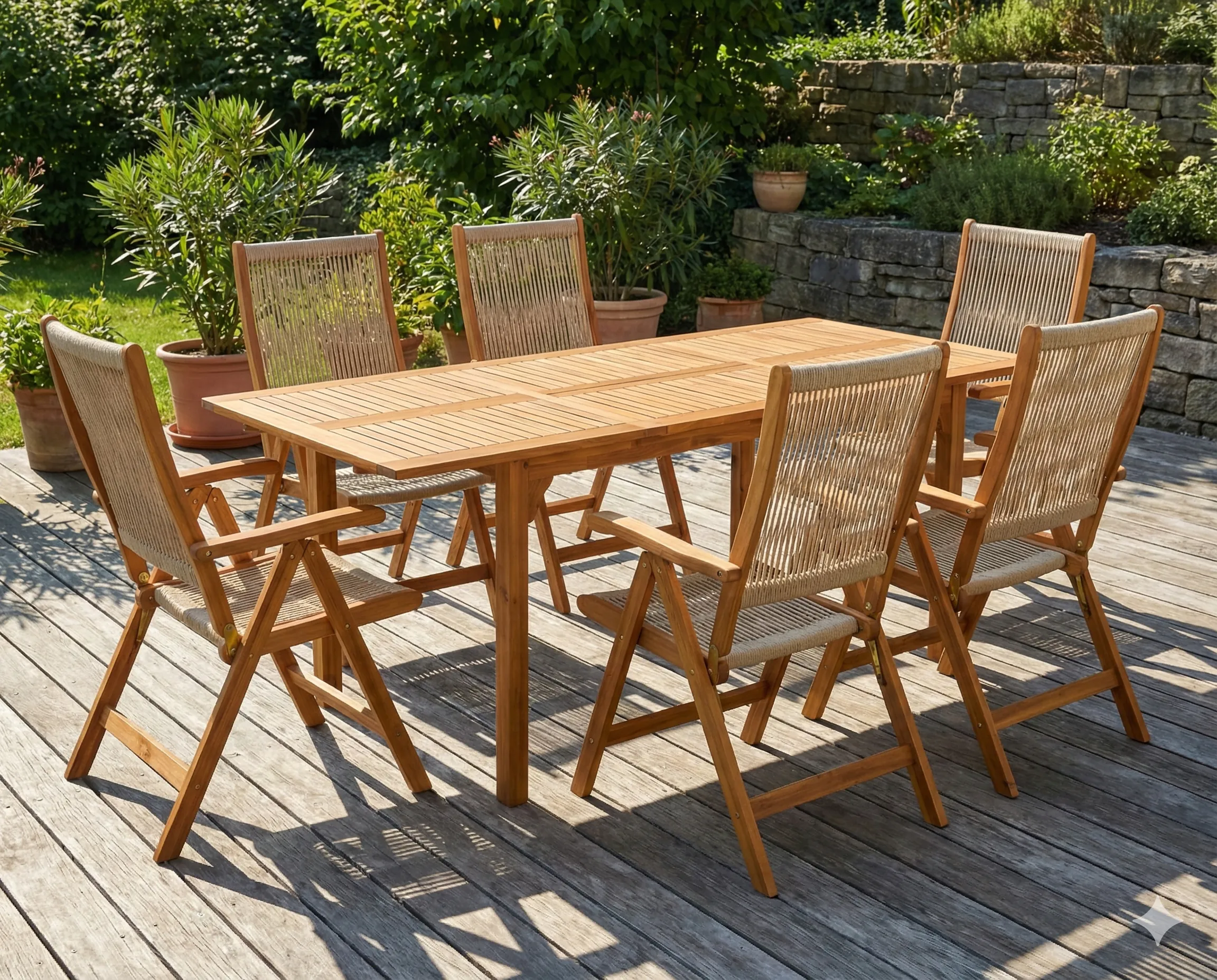 Zestaw mebli drewnianych AKADIA 210/6 z krzesłami wykończonymi sznurem marki Bjørkka to połączenie dopracowanego designu i solidnego wykonania. Rozkładany stół z egzotycznej akacji o długości do 210 cm stanowi centralny element kompletu, uzupełniony o sześć komfortowych krzeseł wykończonych sznurem. Olejowane drewno zapewnia odporność na warunki atmosferyczne oraz elegancki wygląd, który doskonale wpisuje się w aranżacje ogrodowe i tarasowe klasy premium.