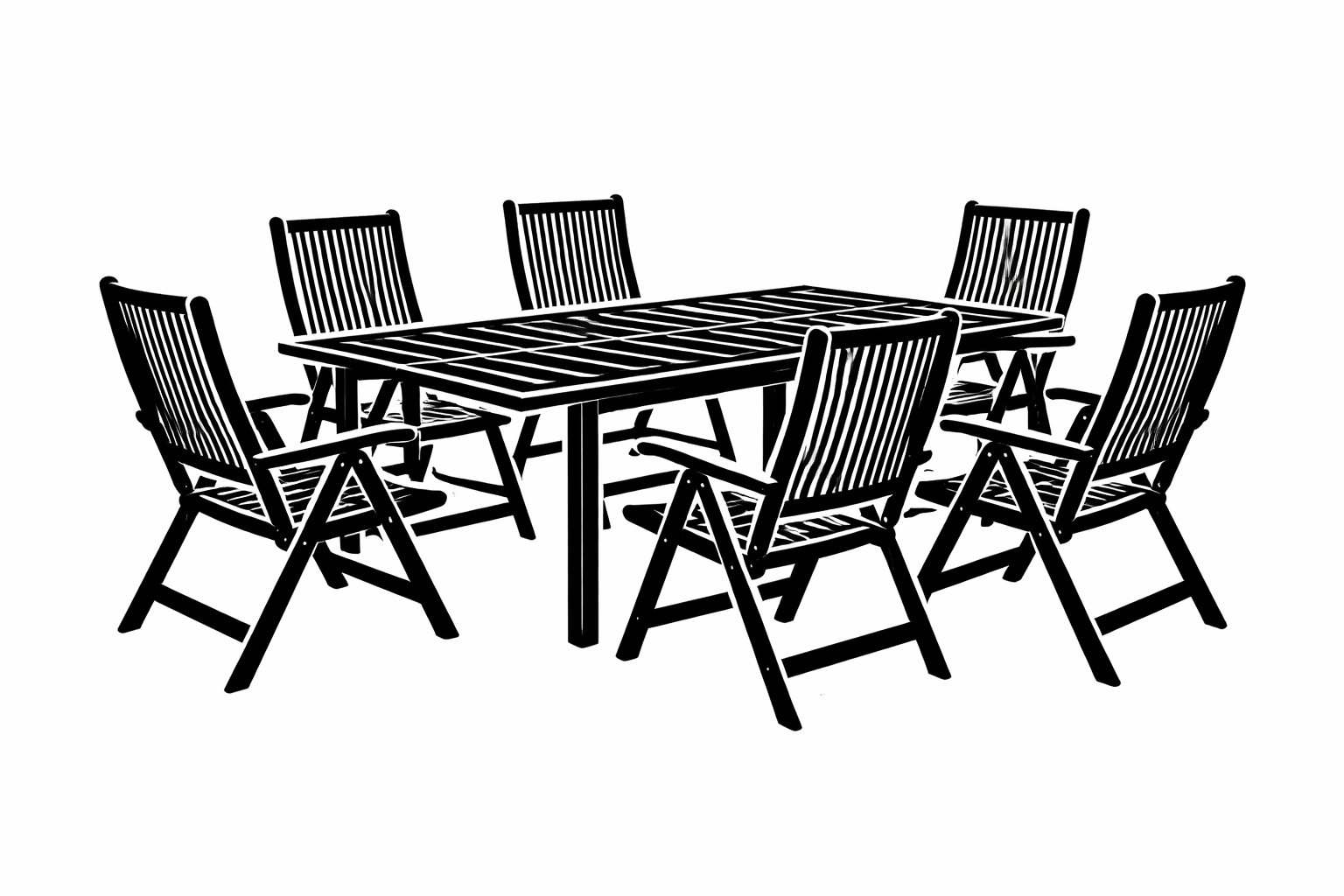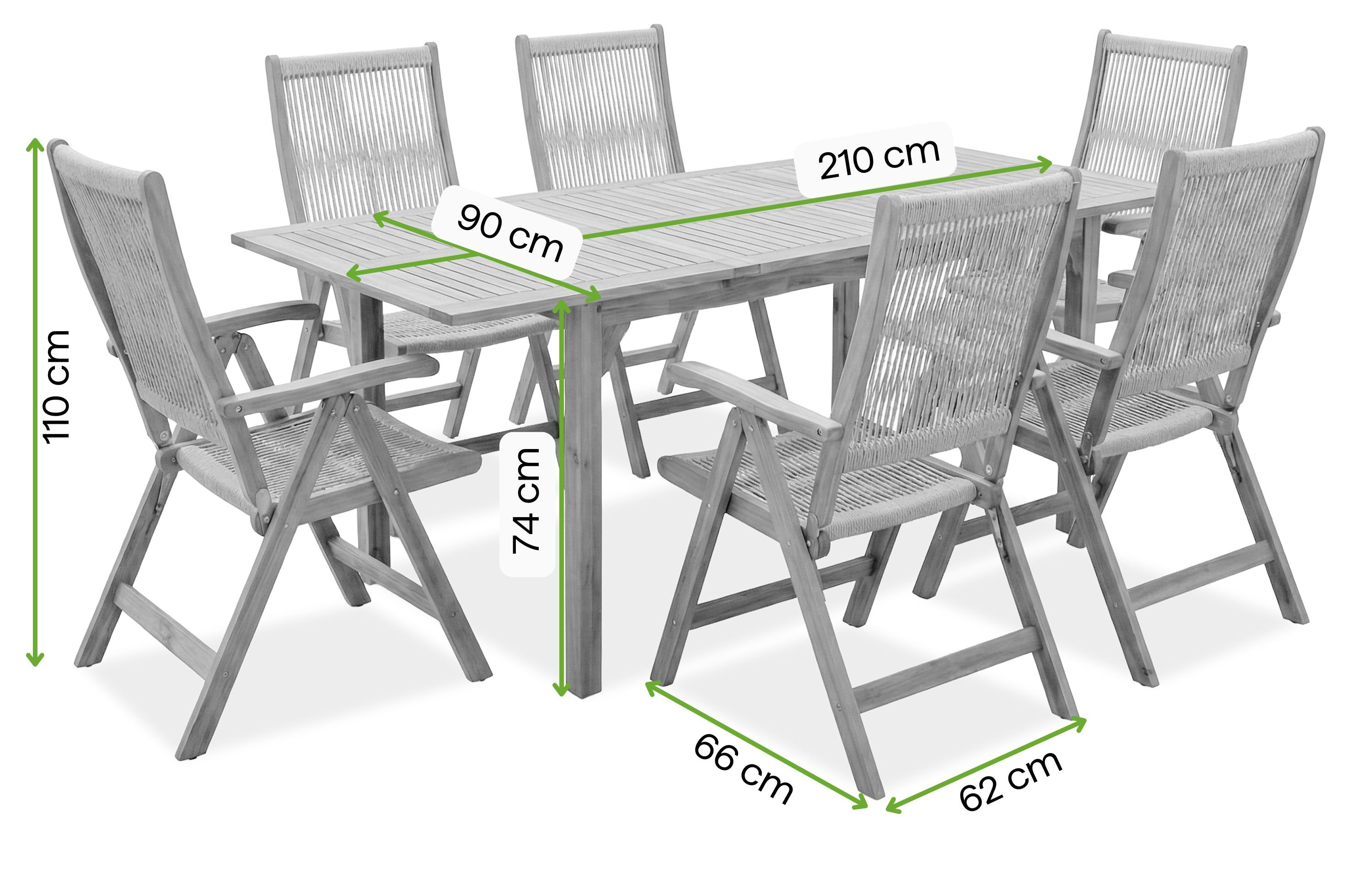 Komplet obejmuje rozkładany stół oraz sześć krzeseł, przeznaczonych do wspólnego użytkowania w przestrzeni ogrodowej lub tarasowej.
