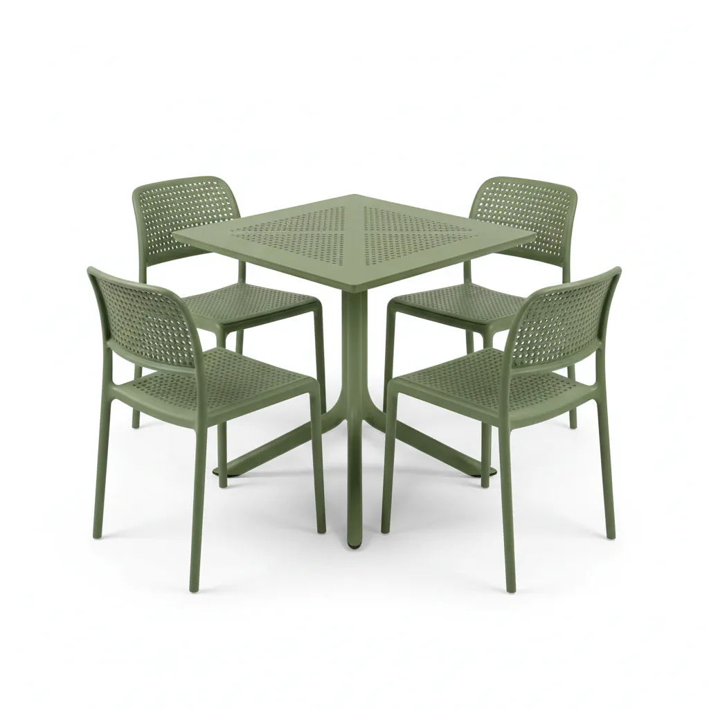 Zestaw mebli jadalnianych BORA BISTROT/CLIP od Nardi w kolorze AGAVE to nowoczesny, premium komplet stworzony przez renomowaną włoską markę Nardi. Te wytrzymałe meble są przeznaczone zarówno dla wymagającego sektora HoReCa (hotele, restauracje, kawiarnie), jak i dla klientów prywatnych szukających trwałych i stylowych rozwiązań do ogrodu czy na taras. Zestaw charakteryzuje się wykorzystaniem najwyższej jakości polipropylenu wzmocnionego włóknem szklanym, co gwarantuje wyjątkową odporność potwierdzoną certyfikatem CATAS. Meble są odporne na zmienne warunki pogodowe – deszcz, mróz, śnieg oraz intensywne promieniowanie UV – dzięki czemu nie blakną i mogą stać na zewnątrz przez cały rok bez potrzeby konserwacji. Komplet BORA BISTROT/CLIP obejmuje stół i cztery sztaplowane krzesła, które zapewnią komfortowe miejsce do spożywania posiłków dla czterech dorosłych osób. Nie czekaj, zainwestuj w niezawodną jakość Nardi i ciesz się stylem oraz komfortem przez wiele sezonów!