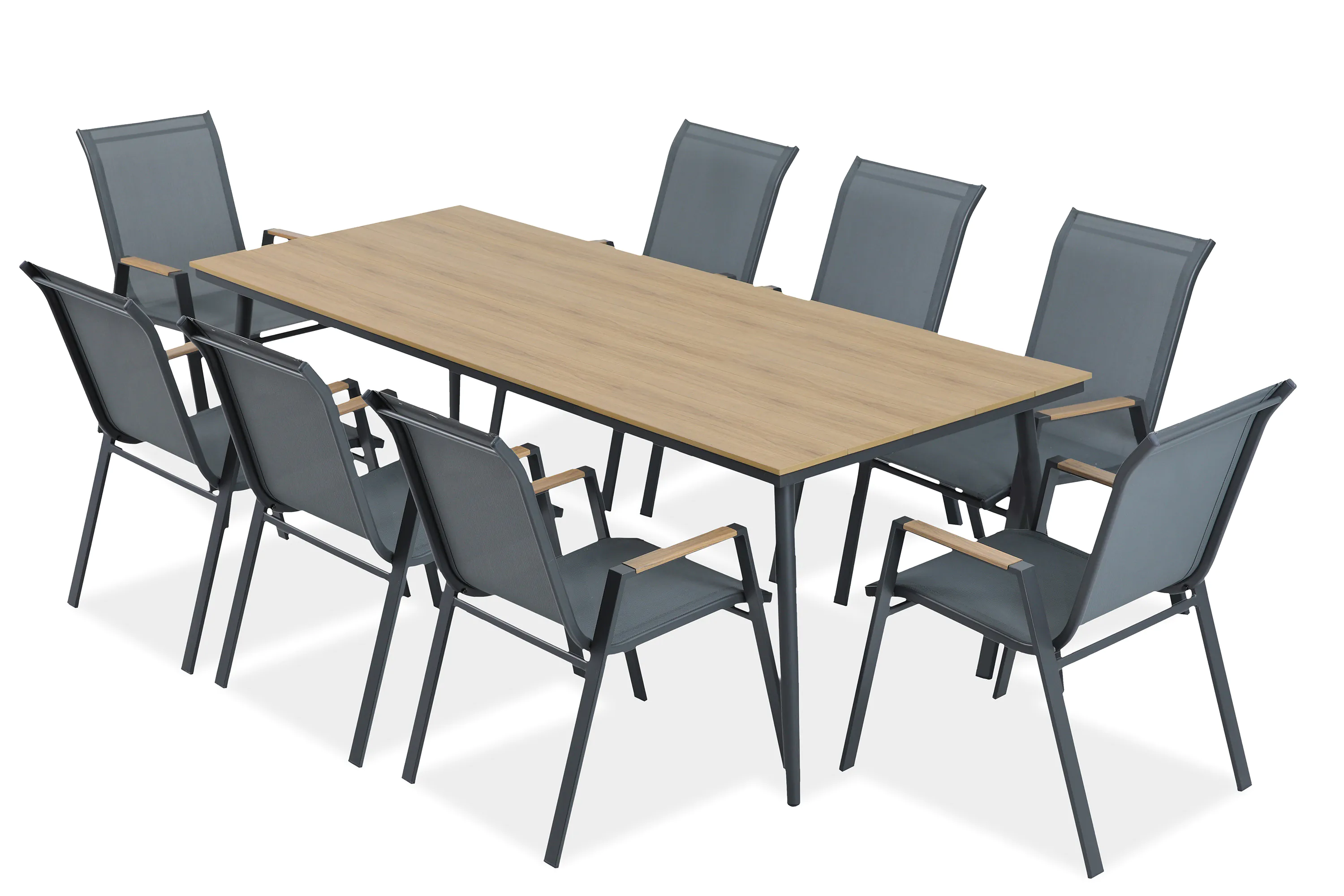 Zestaw mebli jadalnianych do ogrodu NOVA DINING 8+1 Dark Grey – Bjørkka to nowoczesne i przestronne rozwiązanie do ogrodu, na taras lub werandę, stworzone z myślą o większych spotkaniach na świeżym powietrzu. Elegancka kolorystyka dark grey dobrze wpisuje się w współczesne aranżacje i łatwo łączy z innymi elementami wyposażenia. Konstrukcja z aluminium zapewnia lekkość, stabilność i odporność na warunki atmosferyczne, a blat stołu z polywood łączy naturalny wygląd drewna z wysoką trwałością i prostą pielęgnacją. W zestawie znajduje się duży stół oraz osiem wygodnych krzeseł z siedziskami z textline, które dobrze dopasowują się do sylwetki i są przystosowane do użytkowania na zewnątrz. To praktyczny i estetyczny wybór dla osób ceniących solidne, funkcjonalne meble ogrodowe do jadalni zewnętrznej.
