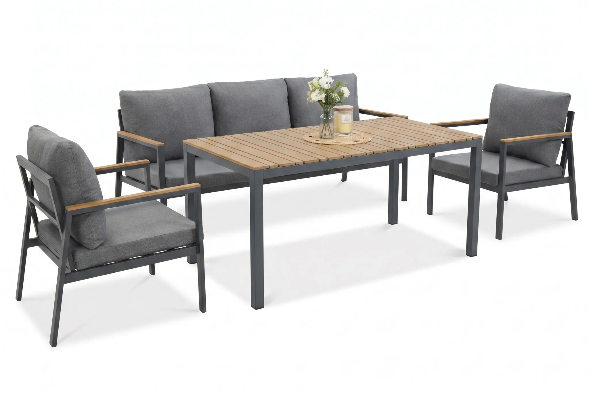 Zestaw mebli jadalnianych EDISON DINING Dark Grey – Bjørkka to nowoczesna propozycja do ogrodu i na taras, łącząca elegancki design z wysoką funkcjonalnością. Zestaw tworzy komfortową przestrzeń do wspólnych posiłków i relaksu na świeżym powietrzu, sprawdzając się zarówno w codziennym użytkowaniu, jak i podczas spotkań towarzyskich. Konstrukcja wykonana ze stali zapewnia stabilność i trwałość, a blat stolika z polywoodu o grubości 12 mm estetycznie imituje naturalne drewno, nie wymagając impregnacji ani skomplikowanej pielęgnacji, a jednocześnie pozostając odpornym na warunki atmosferyczne. W skład zestawu wchodzą dwa fotele, sofa oraz stolik jadalniany. Całość stanowi spójne, wygodne i praktyczne rozwiązanie dla nowoczesnych aranżacji ogrodowych i tarasowych.