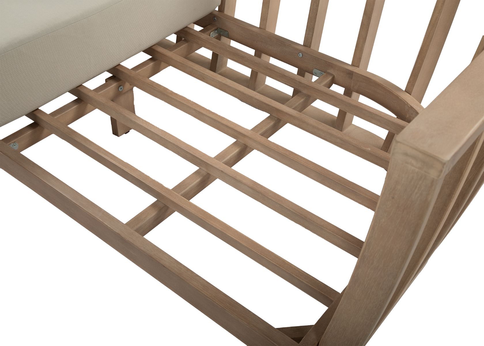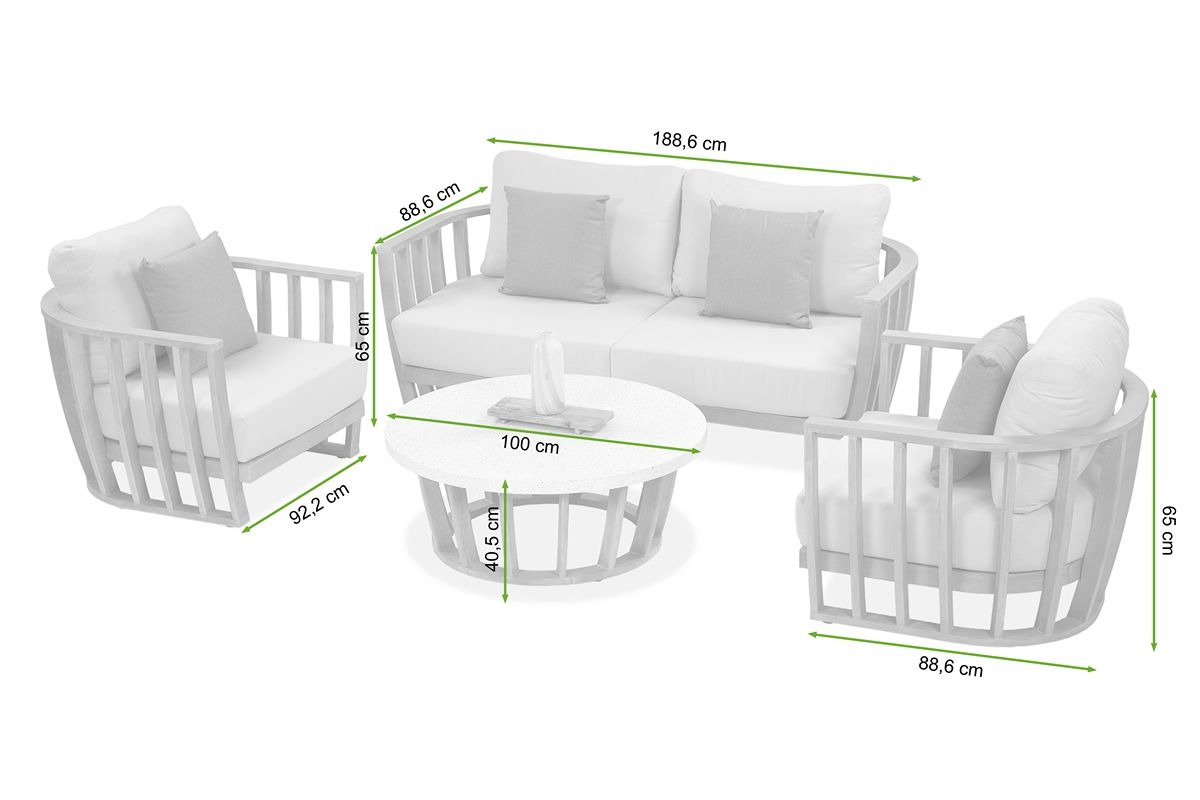 Stelaż mebli wykonano z trwałego drewna eukaliptusowego, które charakteryzuje się dużą twardością i odpornością na warunki atmosferyczne. Grube profile i przemyślana budowa zapewniają stabilność całego zestawu oraz bezpieczeństwo użytkowania przez wiele sezonów.