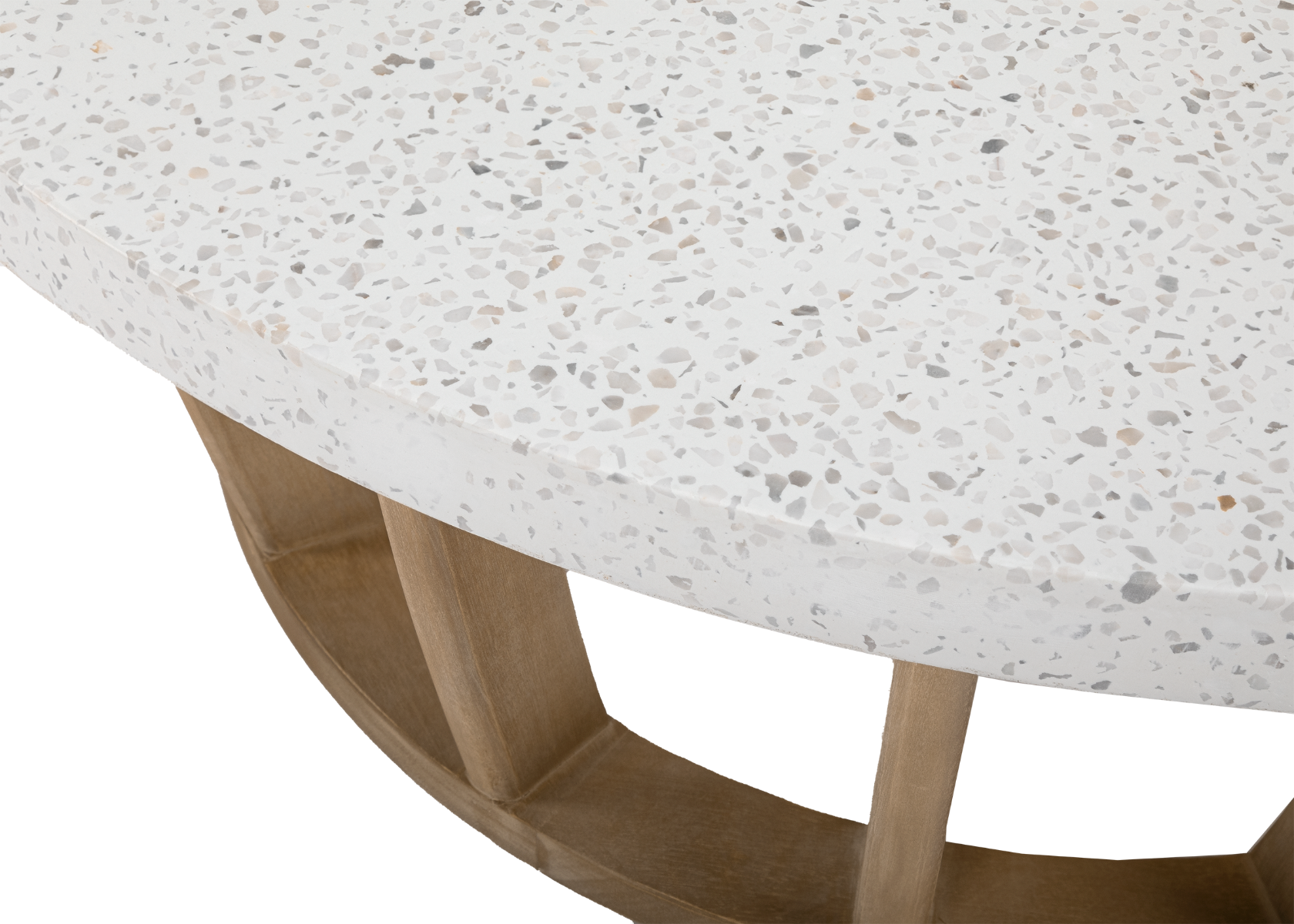Okrągły blat o średnicy 100 cm i grubości 4 cm wykonano z cementowego lastryko, które wyróżnia się nowoczesnym wyglądem i dużą odpornością. Stabilna konstrukcja o wadze 42 kg zapewnia solidność, a minimalistyczna forma doskonale dopełnia cały zestaw wypoczynkowy.