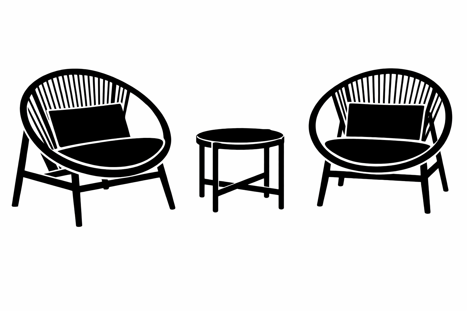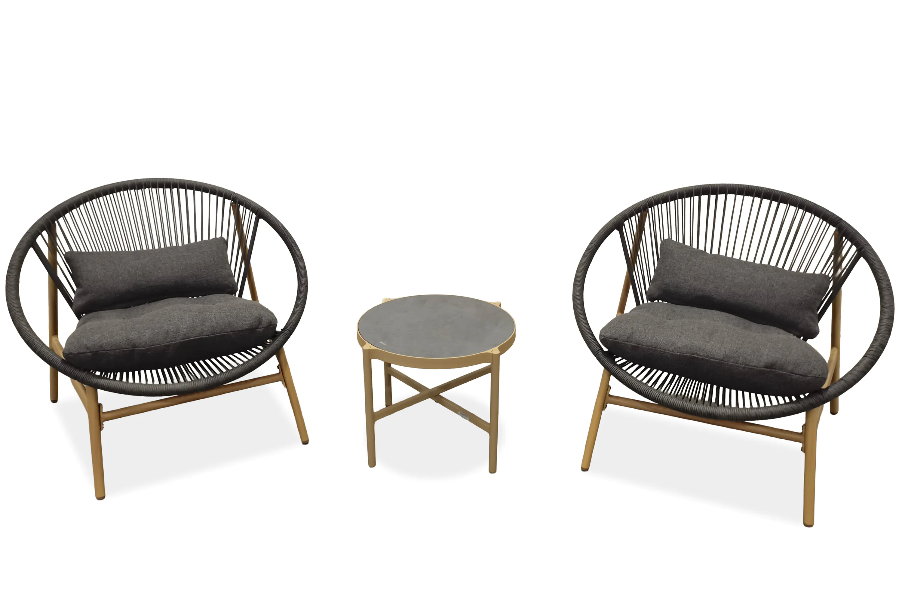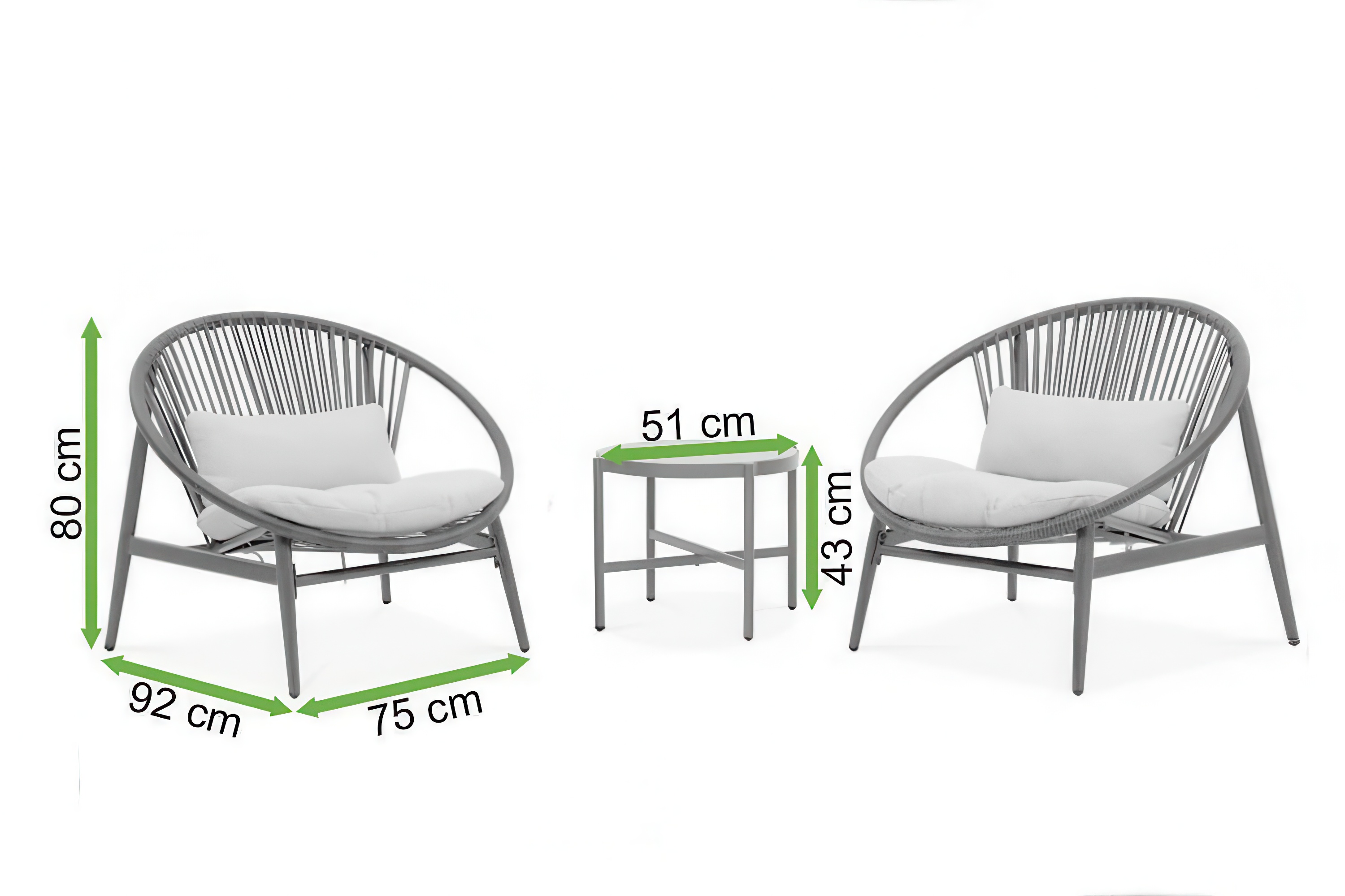 Komplet składa się z dwóch foteli oraz stolika, co pozwala stworzyć gotową strefę wypoczynkową. Sprawdza się w codziennym użytkowaniu na tarasie, balkonie lub w ogrodzie.