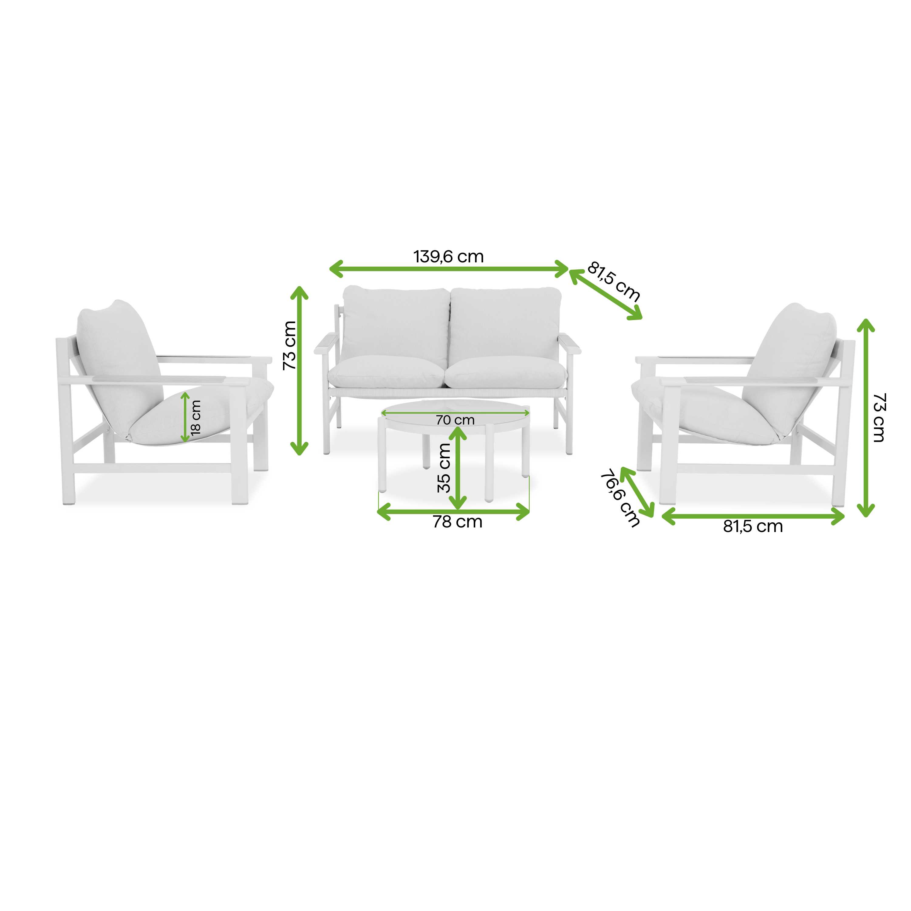 Maksymalna odporność na warunki pogodowe: Całoroczna rama odporna na korozję i promienie UV sprawia, że meble nie blakną i nie niszczeją, stojąc na zewnątrz przez cały rok. Zaleca się chowanie poduszek na zimę, by przedłużyć ich żywotność.