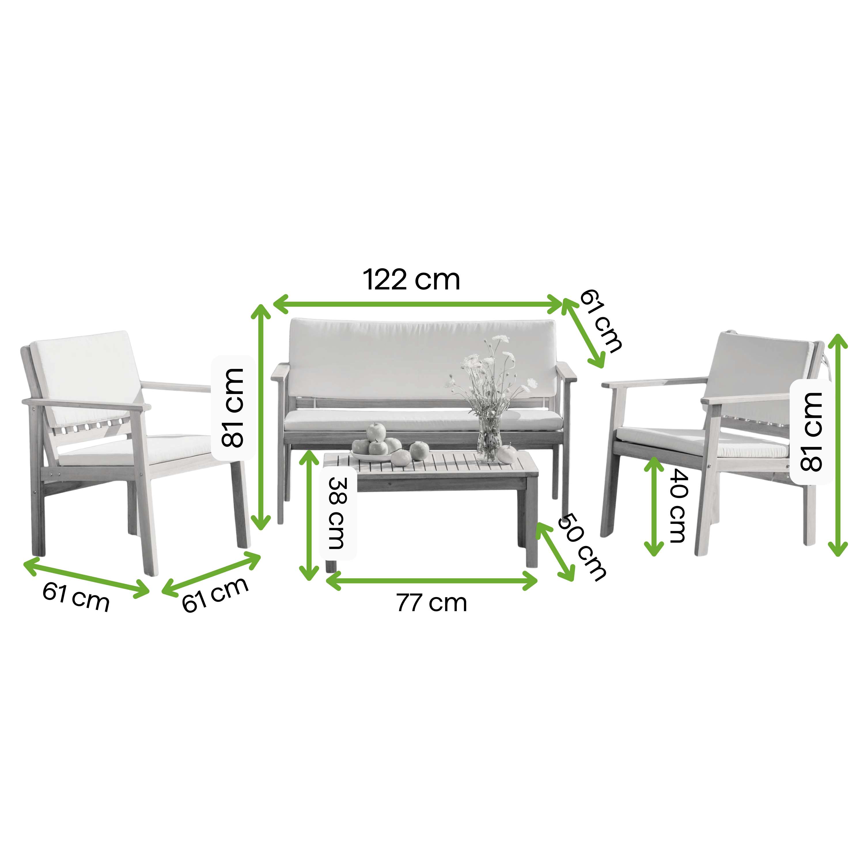 Kompaktowe i przemyślane wymiary Idealnie wyważone gabaryty mebli sprawiają, że zestaw zmieści się nawet na mniejszych tarasach, nie tracąc przy tym nic ze swojej funkcjonalności.