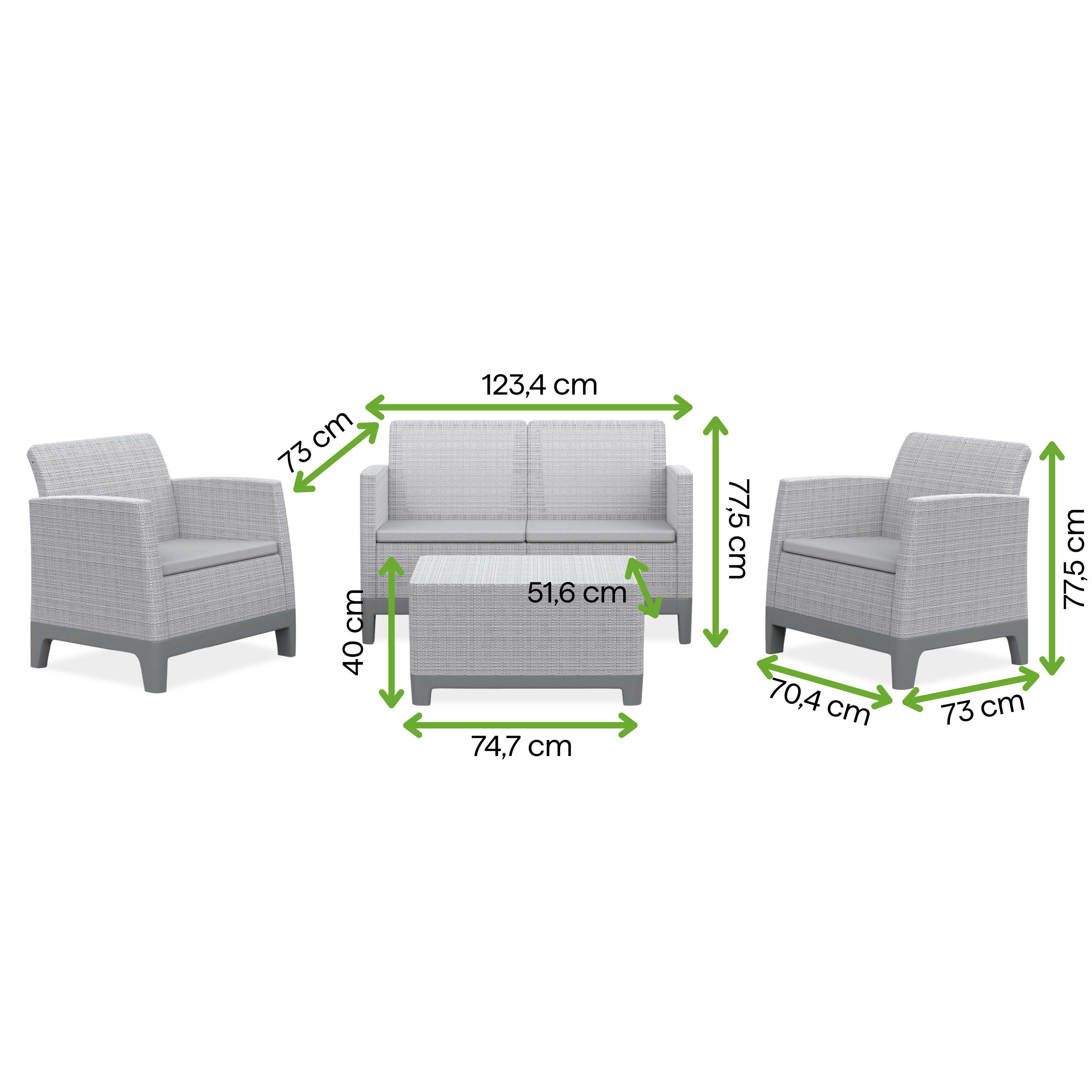 Modne zestawienie kolorystyczne: Zastosowanie dwóch odcieni szarości podkreśla nowoczesny design zestawu, sprawiając, że meble wyglądają niezwykle prestiżowo w każdym ogrodzie i tarasie.