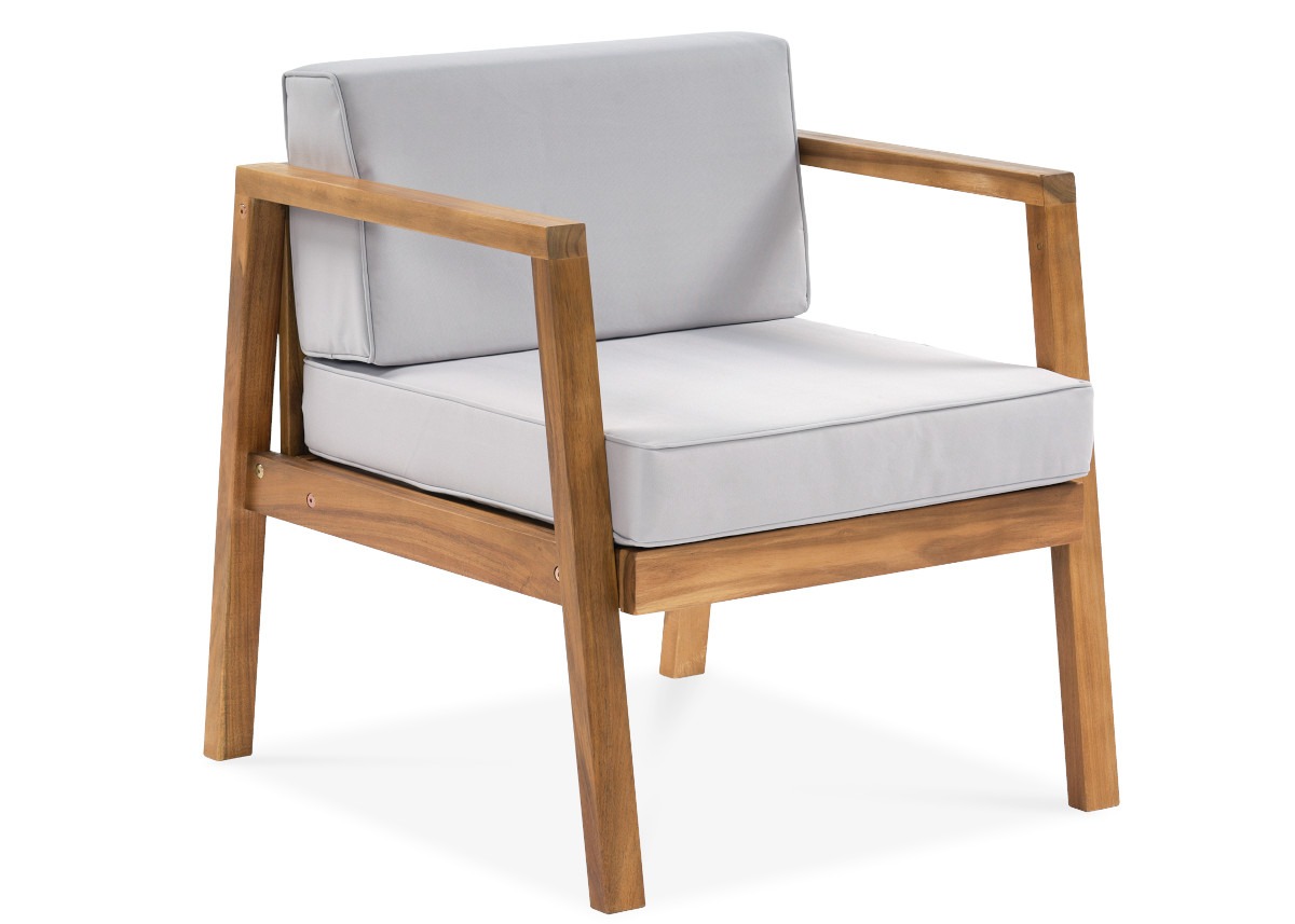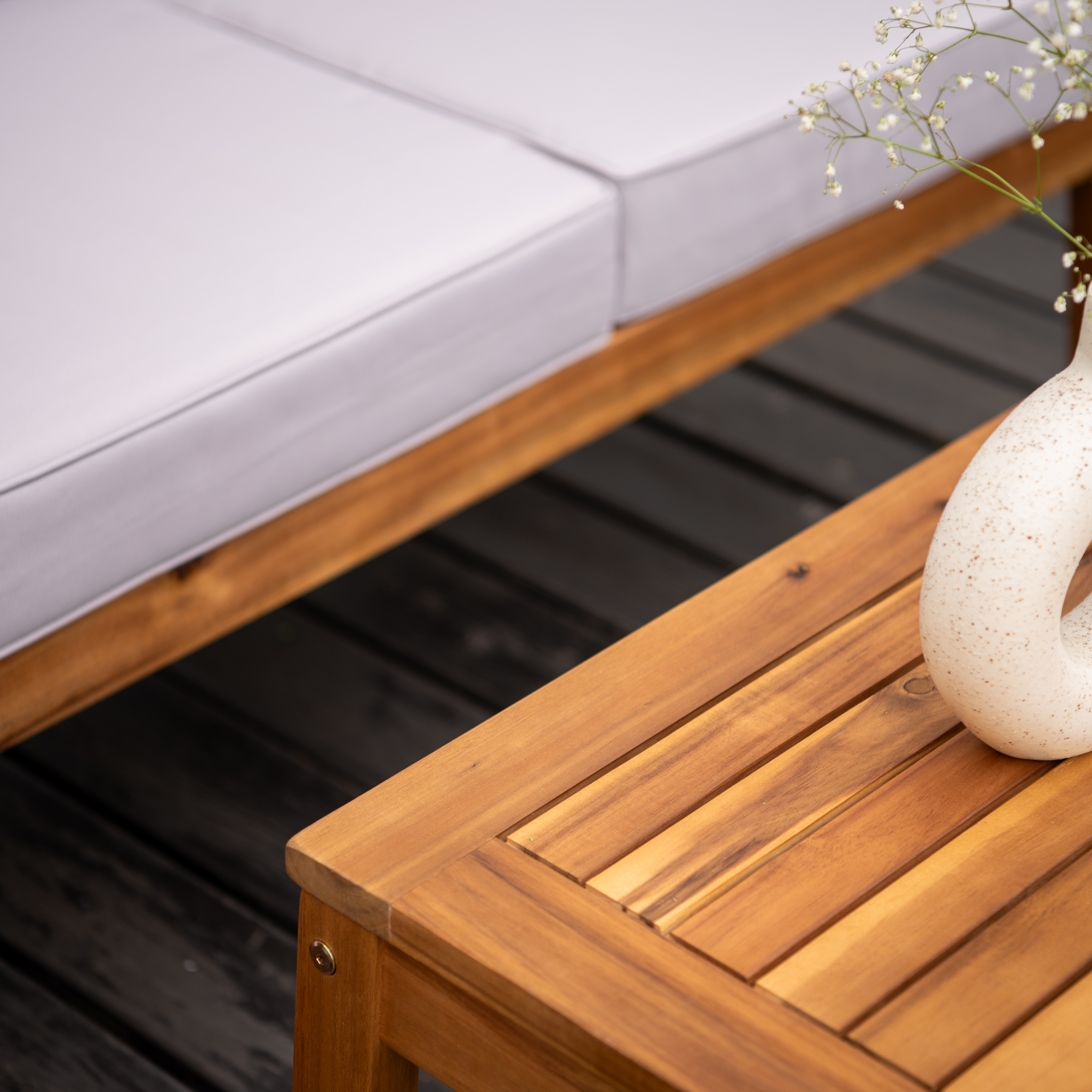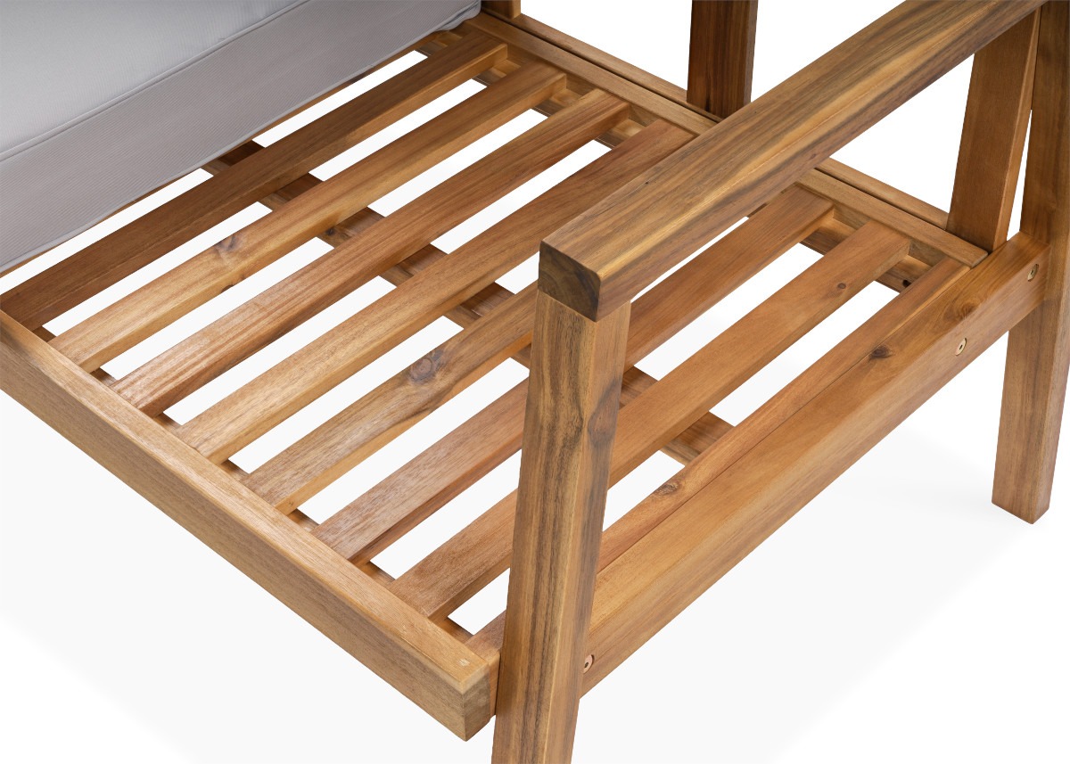 Stelaż wykonany w całości z drewna akacjowego zapewnia naturalny wygląd i wysoką trwałość. To rozwiązanie łączy elegancję z odpornością na warunki zewnętrzne. Drewniana konstrukcja podkreśla spójność designu całego zestawu i nadaje mu ciepły, ponadczasowy charakter.