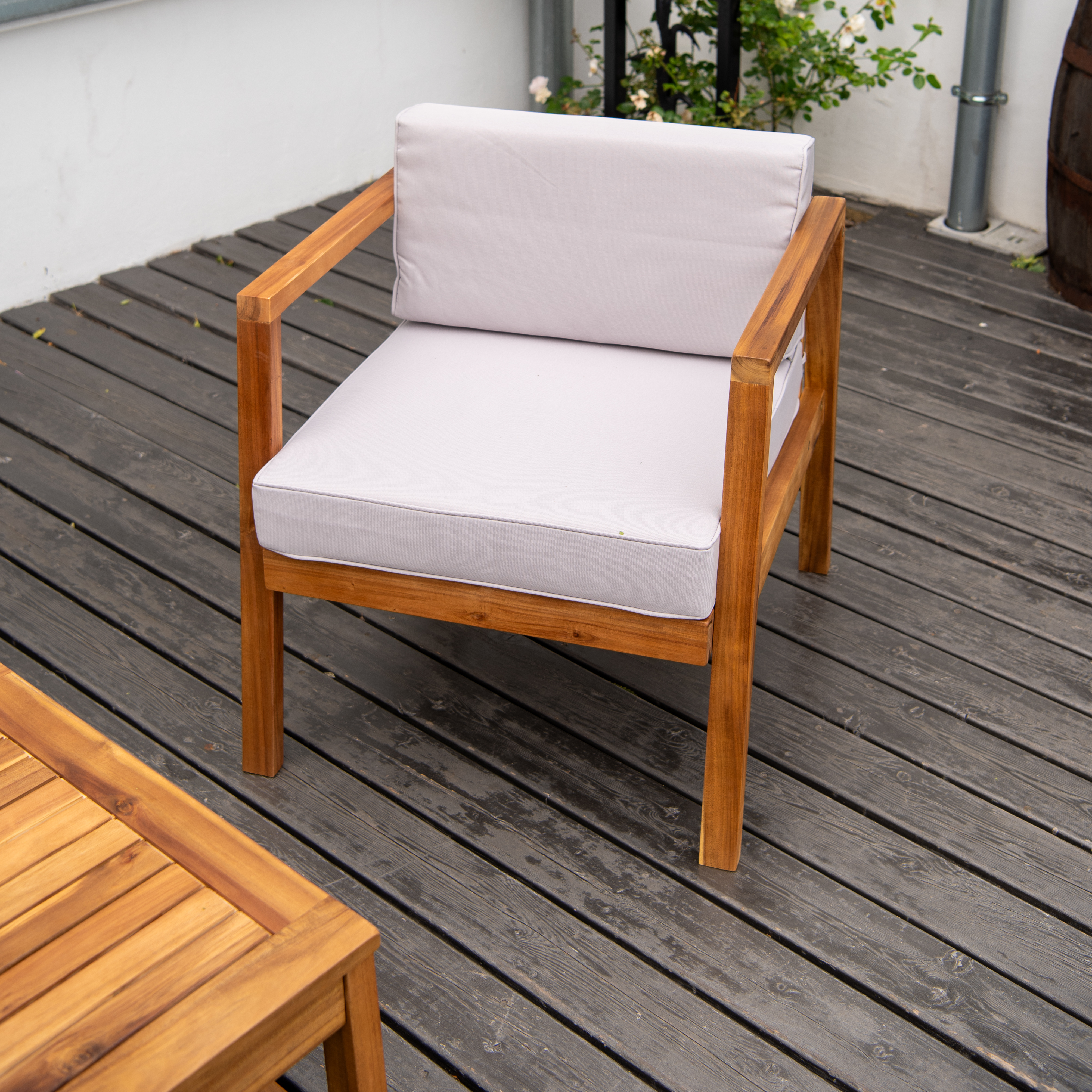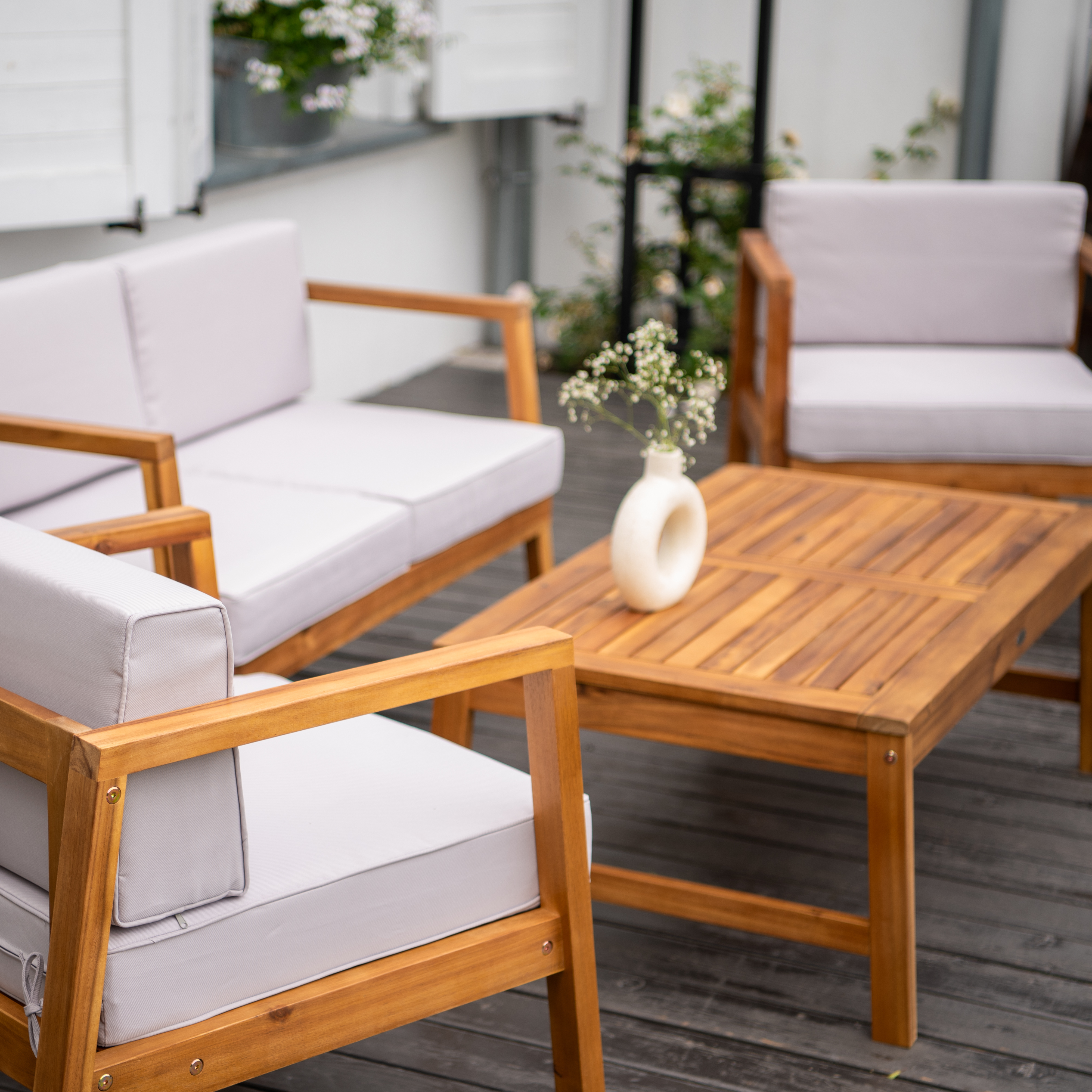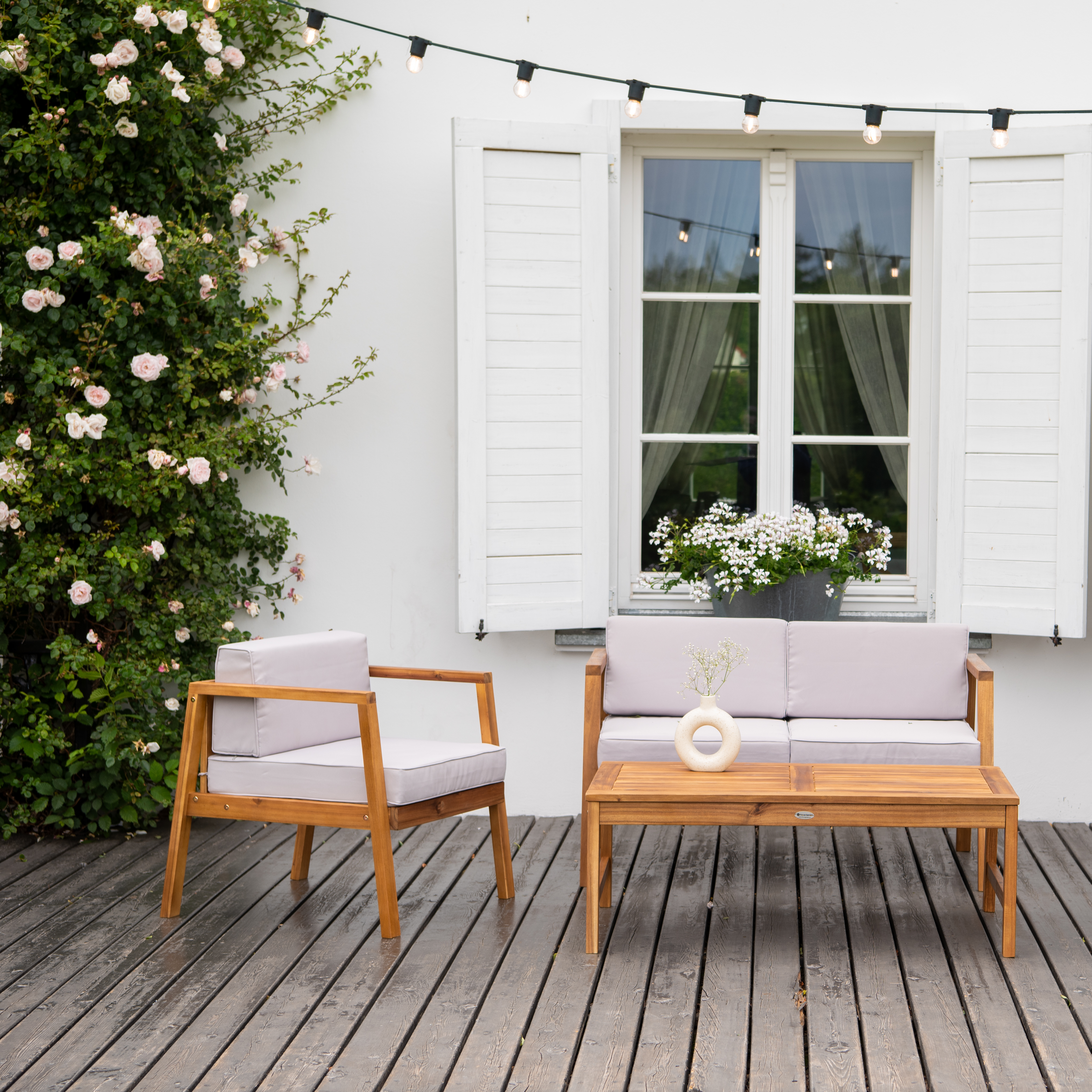 Zestaw mebli ogrodowych MALMO CAFFE to harmonijne połączenie wygody, trwałości i stylowego designu, idealne do wypoczynku na tarasie, balkonie czy w ogrodzie. Wykonany z naturalnego drewna akacjowego z olejowanym wykończeniem, gwarantuje odporność na warunki atmosferyczne i łatwość pielęgnacji. Komfort zapewniają grube, jasnoszare poduszki z wodoodporną powłoką, które można łatwo zdjąć i wyprać. MALMO CAFFE to funkcjonalność, elegancja i wygoda w jednym, gotowe na wiele sezonów użytkowania.