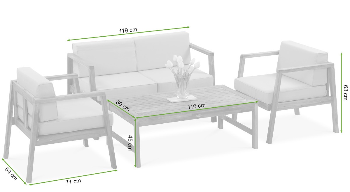Zestaw składa się z: sofa, stół, 2x krzesła, poduszki