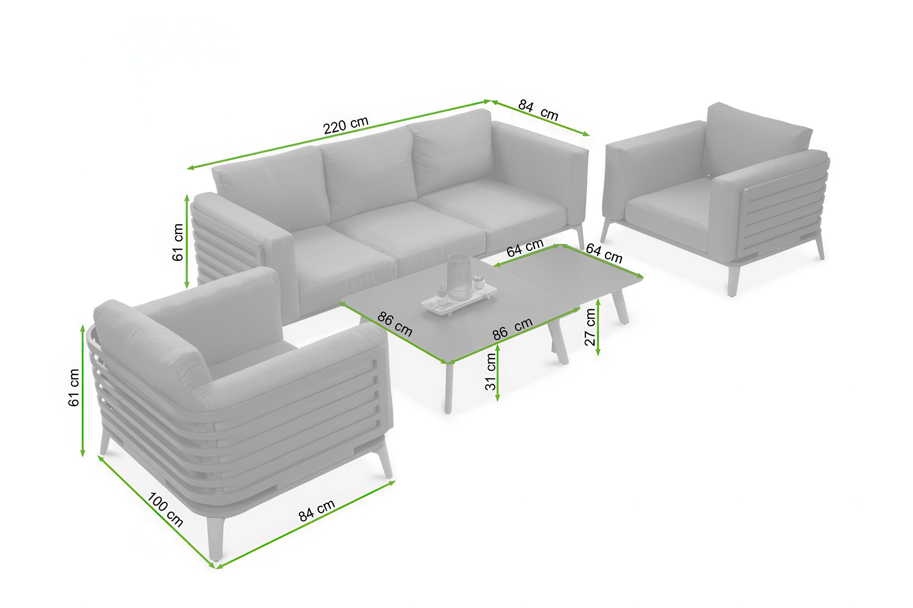 Zestaw składa się z sofy 3-osobowej, 2 foteli oraz dużego i małego stolika kawowego.