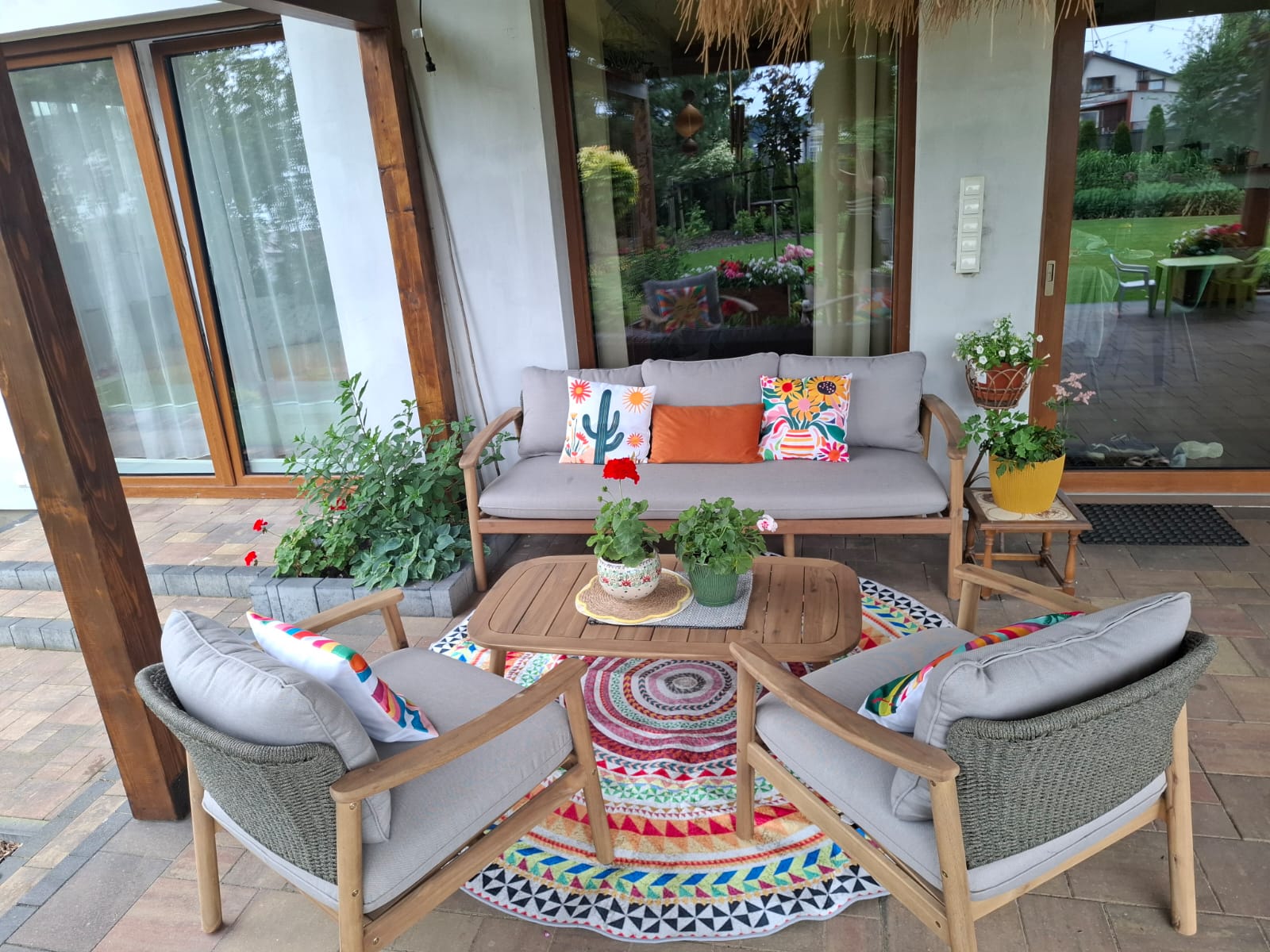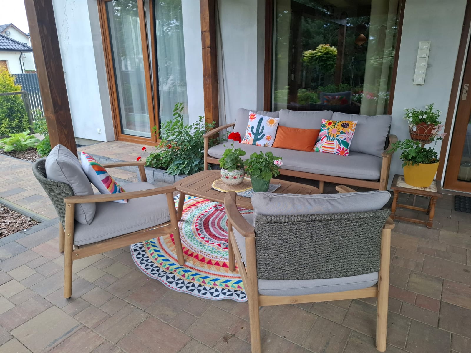 Zestaw składa się z: sofa, stół, 2x fotele, poduszki