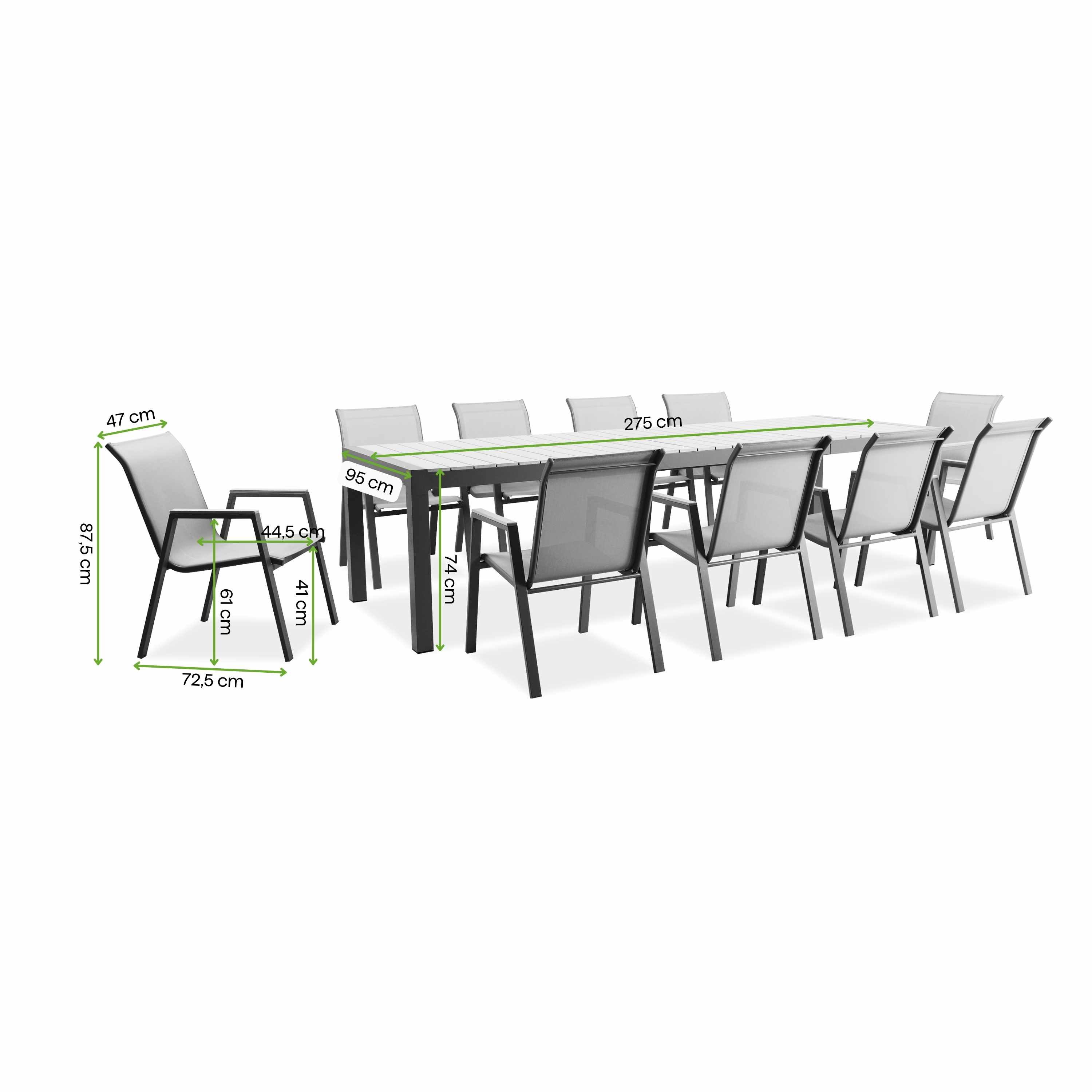 Komplet obejmuje stół oraz 10 krzeseł ogrodowych