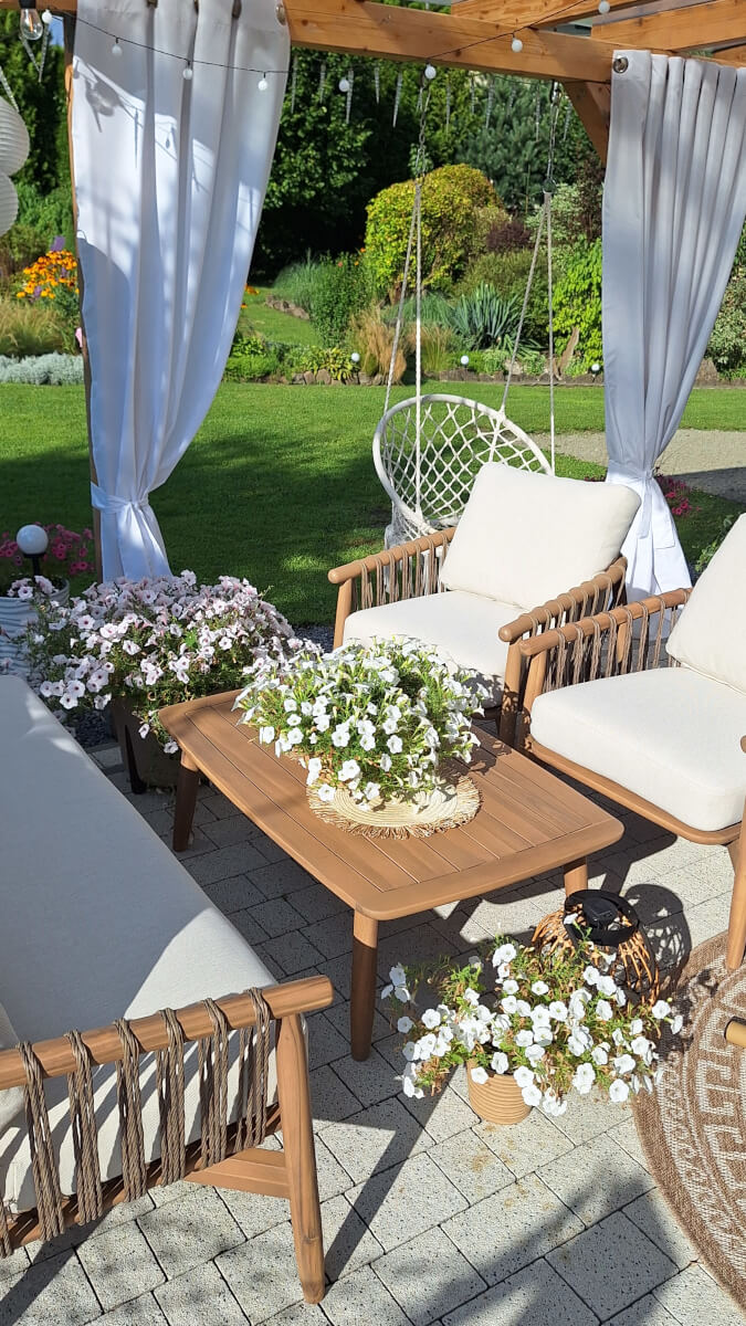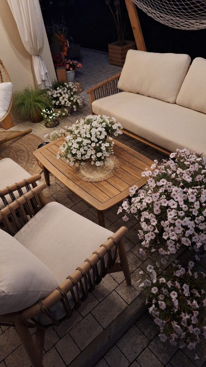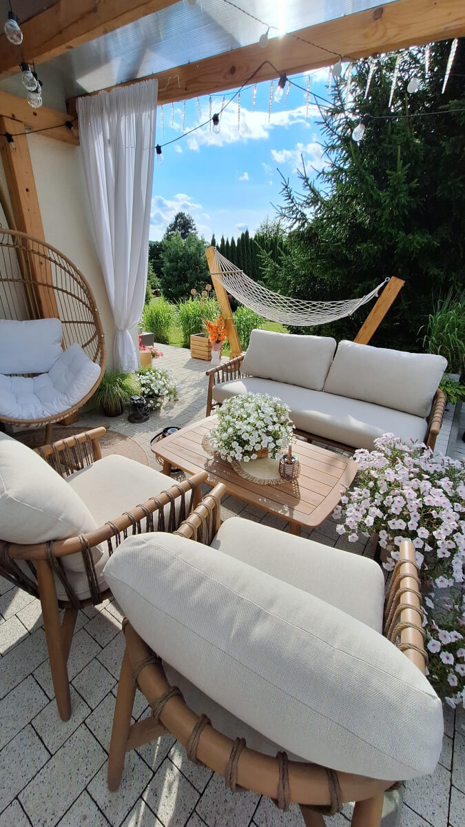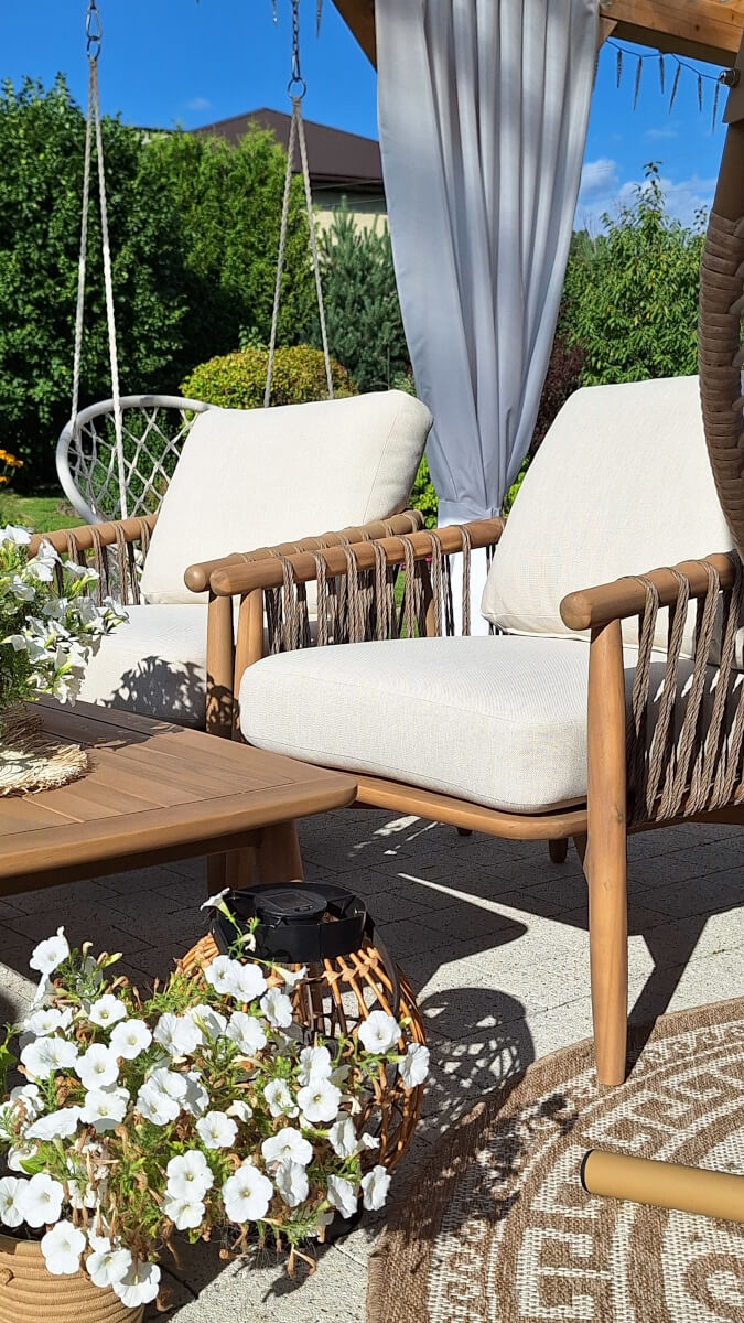 Idealny na letnie wieczory i spotkania - zestaw stwarza przytulną atmosferę do spędzania czasu z rodziną i przyjaciółmi w ogrodzie lub na tarasie