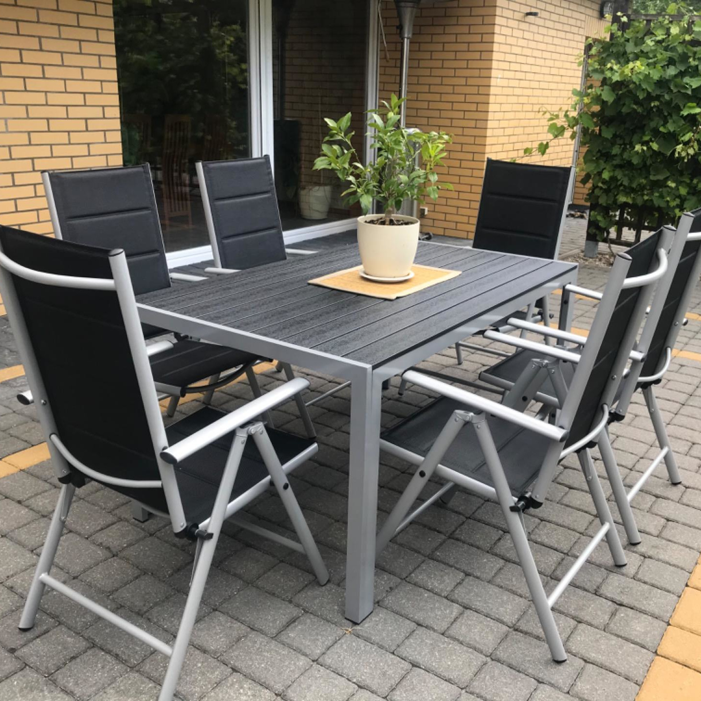 komplet składa się z 6 pozycjonowanych krzeseł oraz dużego, prostokątnego stołu