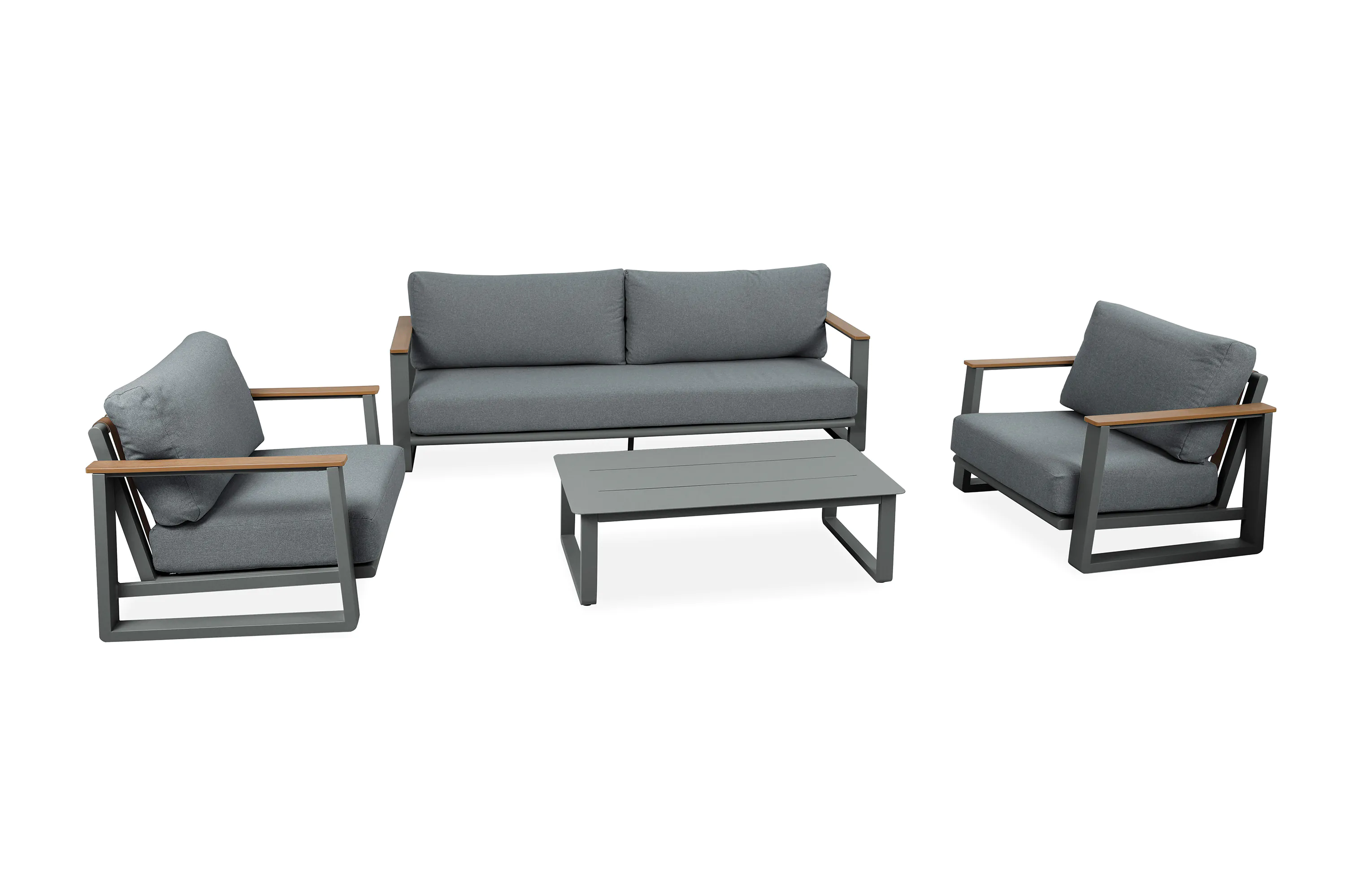 Zestaw ogrodowy TENERIFE CAFFE Grey marki FURRORE to synonim nowoczesnej elegancji w szarej odsłonie. Aluminiowa konstrukcja łączy lekkość z wytrzymałością, a detale z polywood i stylowa plecionka nadają całości prestiżowy sznyt. Hydrofobowe tkaniny Olefin oraz Spunpoly gwarantują trwałość, podczas gdy poduszki oparcia o grubości 27 cm oferują nieziemski komfort. Ten komplet wypoczynkowy tarasowy to idealny wybór dla osób ceniących skandynawski minimalizm i bezkompromisową wygodę.