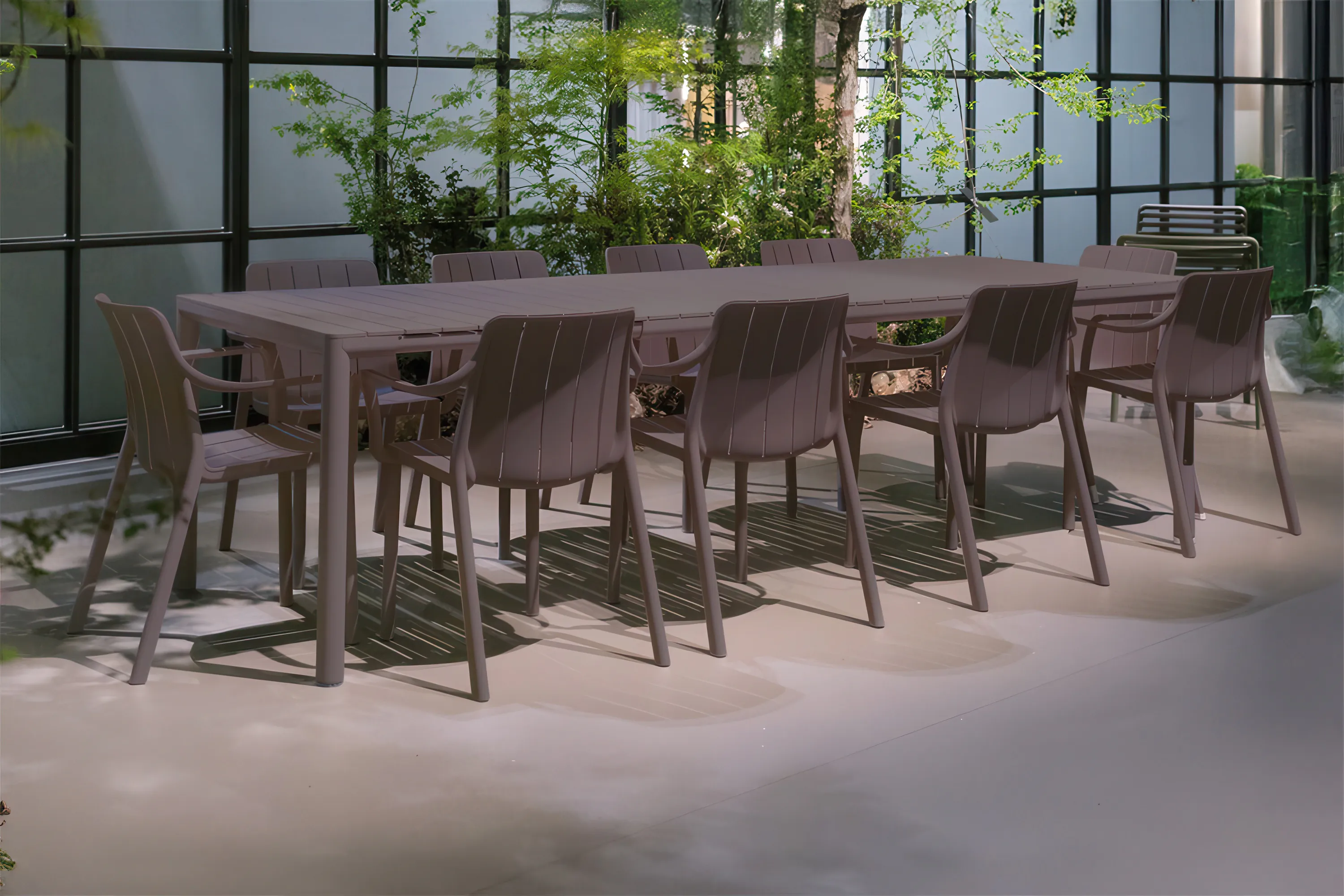 Zestaw obejmuje dziesięć krzeseł Tiberina z wygodnymi podłokietnikami oraz rozkładany stół Tevere z regulowanym blatem. To idealne rozwiązanie do rodzinnych obiadów, spotkań z przyjaciółmi czy eleganckich przyjęć na świeżym powietrzu.