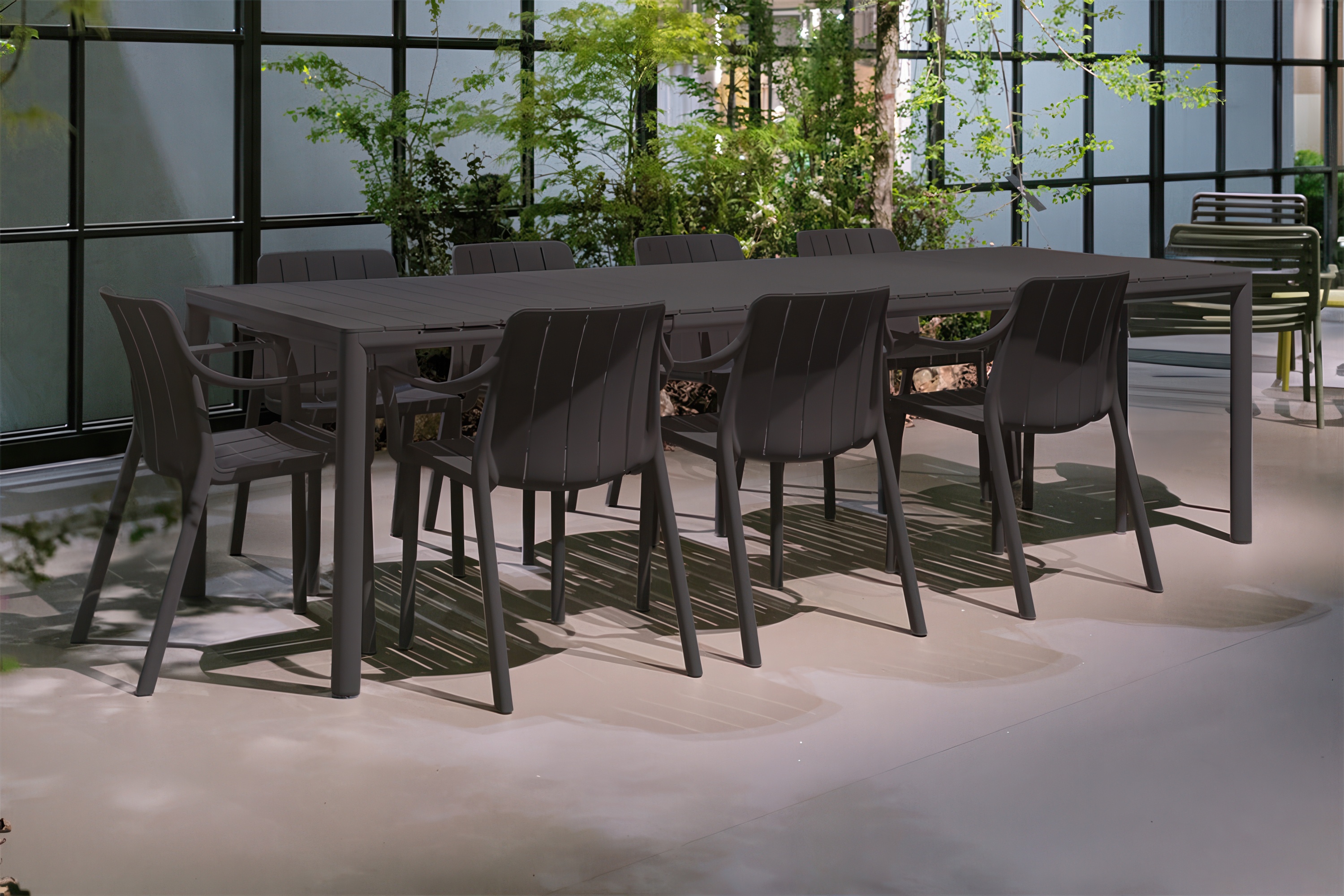 Zestaw tarasowy TIBERINA / TEVERE 210-275 8+1 Anthracite marki Nardi łączy w sobie funkcjonalność, trwałość i wyrazisty design. Idealny na nowoczesne tarasy i do ogrodów, a także do lokali gastronomicznych. W jego skład wchodzi osiem krzeseł Tiberina z podłokietnikami oraz rozkładany stół Tevere z blatem, którego długość można regulować od 211 cm do 275 cm. Krzesła wyróżniają się ergonomiczną konstrukcją, matowym wykończeniem i podłokietnikami, które zapewniają wygodę nawet podczas długich posiłków. Krzesła wykonano z jednolicie barwionych żywic polipropylenowych wzmocnionych włóknem szklanym z dodatkami UV, co zapewnia im odporność na promieniowanie UV i zmienne warunki pogodowe.