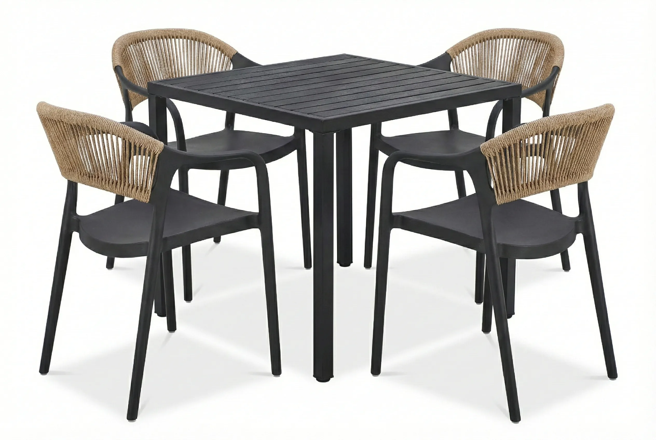 Zestaw tarasowy TESSA/BRIS Black Beige – Bjørkka to nowoczesne i trwałe rozwiązanie na taras, do ogrodu oraz przestrzeni komercyjnych. Stół BRIS posiada solidny blat z tworzywa oraz metalowe nogi zabezpieczone proszkową powłoką elektroforetyczną, co zwiększa odporność na warunki atmosferyczne; jego nośność wynosi do 20 kg. Krzesło TESSA wykonano z wytrzymałego PP z filtrem UV oraz plecionki PE, dzięki czemu jest odporne na słońce i łatwe w utrzymaniu czystości, a jego maksymalne obciążenie to 150 kg. Całość wyróżnia się stabilną konstrukcją, antypoślizgowymi stopkami oraz możliwością wygodnego sztaplowania krzeseł.