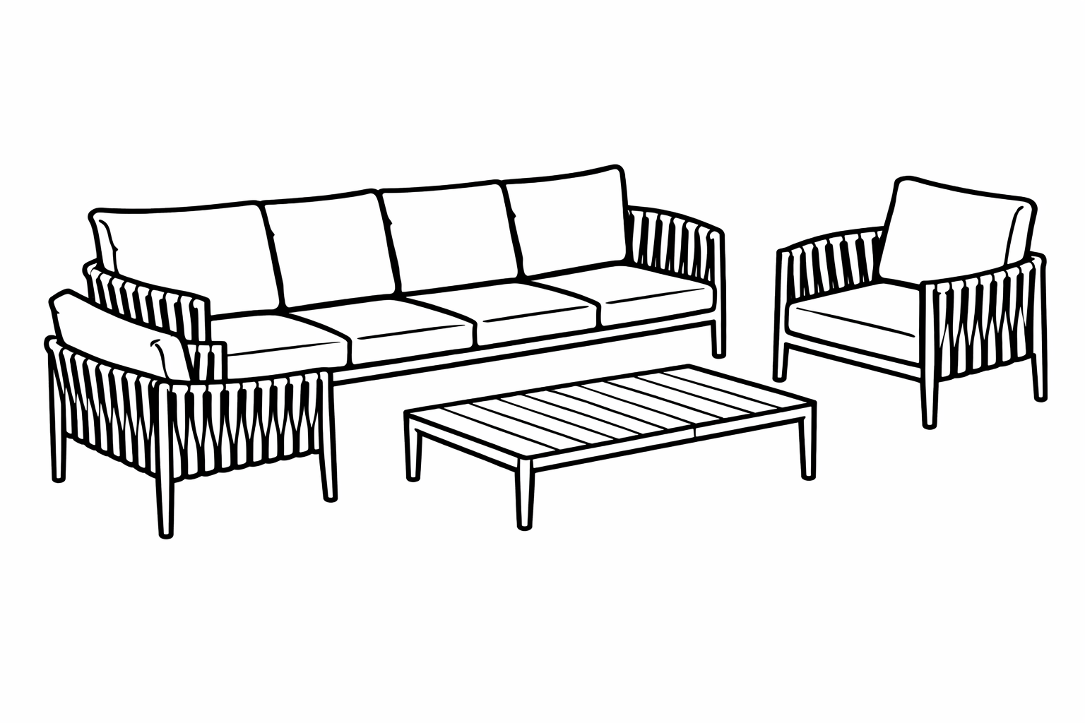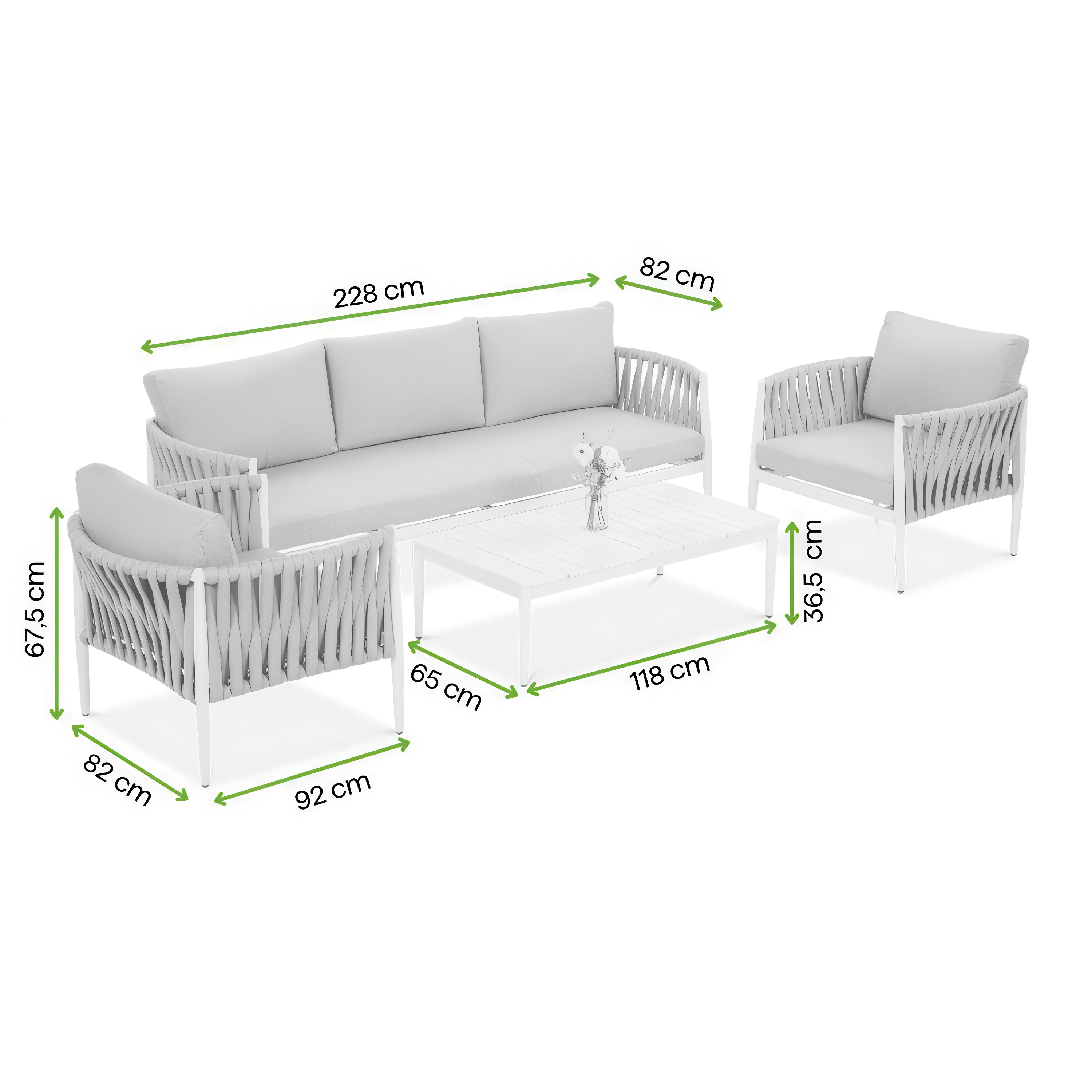 Zestaw wypoczynkowy do ogrodu MONZA Caffe Beige – FURRORE to ekskluzywna propozycja klasy premium, obejmująca 3-osobową sofę, dwa wygodne fotele oraz minimalistyczny stolik kawowy o długości 118 cm, zaprojektowana z myślą o nowoczesnych tarasach, ogrodach i oranżeriach; lekka, a zarazem wytrzymała konstrukcja z aluminium malowanego proszkowo, dekoracyjne oparcia wykonane z grubego nylonowego sznura nadają meblom unikalny, designerski charakter, który doskonale współgra z jasną, elegancką kolorystyką; miękkie, komfortowe poduszki ze zdejmowanymi poszewkami podnoszą wygodę użytkowania i ułatwiają utrzymanie zestawu w czystości, a wysoka odporność na warunki atmosferyczne oraz promieniowanie UV sprawia, że komplet sprawdzi się zarówno na zewnątrz, jak i wewnątrz.